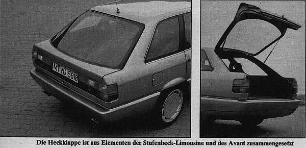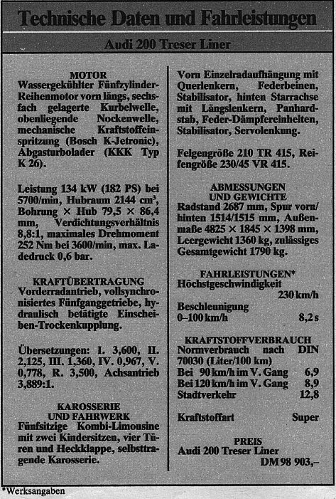 Der Treser Liner : Der Audi Typ44 Avant gefällt nicht jedem. Auch Fritz Haberl nicht. Der damalige CSU-Bundestagsabgeordnete wollte zwar einen Kombi, aber eben keinen Avant. Nun, dem Mann muss geholfen werden, beschloss Walter Treser. Es entstand eine Schräghecklimousine der besonderen Art. Ausgehend von einem Audi 100 Avant (denn 84 gab es den 200er noch nicht als Avant!) wurde diesem ein Teil seines Daches entfernt. Stattdessen wurde die C-Säule und der Heckscheibenbereich einer 100/200er Limousine transplantiert. Das Stummelheck ist wieder nichts anderes als der gekürzte Kofferraumdeckel eines Audi Typ44. Dazu kommen dann die Rückleuchtenblende eines Audi 200 sowie auch die Front eines Audi 200. Lediglich die hinteren Seitenscheiben mussten komplett neu angefertigt werden. Warum eigentlich der Aufwand? Naja, wie gesagt, den 200 Avant gab es noch nicht, und die 200er Limousine besitzt nicht die nötigen Versteifungen für den Umbau. So musste man diesen Umweg gehen. Für den umgebauten 100er Avant muss der Kunde fast 99.000DM hinlegen. Inklusive dem Ausgangsfahrzeug allerdings. Wenn man bedenkt, dass damals ein 200 Turbo nur 45.800,- gekostet hat (und das für damalige Verhältnisse nicht ganz billig war), erkennt man, dass auch für diese Kreation kein besonders großer Markt zu finden war. Der hohe Preis kam aber nicht nur durch den Umbau zustande. Treser spendierte dem Liner auch gleich noch Leder, seine typischen Treserfelgen mit der Michelin-Bereifung, für die die Kootflügelverbreiterungen aus dem Blech getrieben werden mußten. Dazu kamen dann noch die Treser Front- und Heckschürze sowie ein tieferes und strafferes Fahrwerk mit verstärktem vorderen Stabilisator. Der Motor ist weitgehend original und treibt mit seinen 182PS nur die Vorderräder an, da es zu diesem Zeitpunkt noch keinen quattro im Typ44 gab. Für den Fall der quattro Einführung hatte Treser aber auch schon einen Plan: Er wollte den 306PS Motor aus dem Sportquattro implantieren. Und er verwirklichte diese Pläne tatsächlich! | |