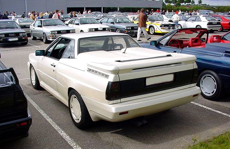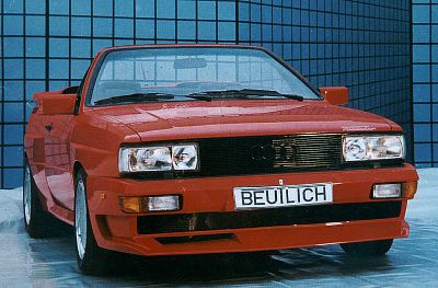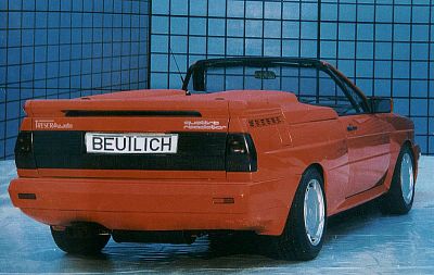 Der Treser quattro Roadster: Während ASC auf ein relativ konventionelles Faltdach zurückgriffen, musste es für Treser natürlich etwas Besonderes sein. Er entwickelte ein versenkbares Hardtop, ähnlich wie dies in der Geschichte schon Ford gemacht hat (und einige andere, die aber noch unbekannter sind). Treser wählte außerdem den Urquattro als Ausgangsfahrzeug und versah in mit seinen typischen Teilen, wie Frontspoiler und Treser-Rädern. Die technische Umsetzung war so gelungen, dass sogar Audi sich dafür interessierte, denn die hatten ja nichts Offenes im Programm. Das ganze Auto sieht geschlossen eher wie ein Pick-Up aus, und das relativ hohe Heckteil des Coupes fällt beim Roadster noch negativer auf, obwohl ich das Heck gelungener als bei ASC finde. | |