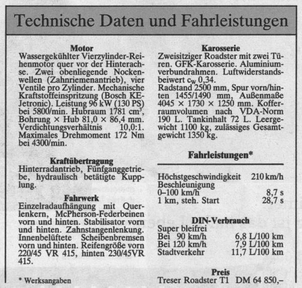 Der Treser Roadster T1 1987 hatte Walter Treser genug davon, "nur" Audis umzubauen. Er entwarf ein eigenes Kleinserienfahrzeug: den Roadster T1. Als Hauptteilespender fungierte hier ein VW Golf GTI 16V. Wie jeder weiß, nicht gerade das schwächste Auto dieser Zeit. Beim Treser war der Motor allerdings quer vor der Hinterachse angeordnet. Wie im Golf sorgte er für recht beachtliche Fahrleistungen. Das Mittelmotorkonzept tat ein übriges: Kurven schnupfte der Treser begierig auf. Allerdings, wer es übertrieb, wurde wie bei allen Mittelmotorfahrzeugen, bestraft: Das geringe Massenträgheitsmoment um die Hochachse macht das Fahrzeug nicht nur sehr agil, sondern im Grenzbereich auch schwer berechenbar. Wer das aber beherrschen kann, wird seine Freude am Fahren haben. Der Roadster ist geschlossen wirklich wie ein Coupe und offen zu luftig, wie der Name "Roadster" verheißt. Die Karosserie ist ein Vorläufer des Space-Frame Design des A8. Eine Gerippe aus Aluminium Strangpressprofilen, an den Kreuzungspunkten über Alu-Guss-Knoten verbunden, trägt allerdings keine Aluhaut. Stattdessen werden Glasfaserteile aufgeklebt, die ebenfalls mittragen. Die Bodengruppe wird zur weiteren Versteifung beidseitig beplankt und der Zwischenraum mit Polyurethanschaum gefüllt. Resultat ist ein solide wirkendes Fahrzeug, dass aber für den hohen Aufwand recht schwer erscheint: 1100kg leer. Gründe sind die Golf Teile der Vorderachse, die in ihrer Dimensionierung an einen Frontmotor angepasst sind, der nicht ganz leichte aber geniale Verdeckmechanismus, die großen Treser-Räder und das Bestreben, auch im offenen Zustand gute Steifigkeitswerte zu erreichen. Trotz all dieser Kniffe und guten Ideen trieb dieses Fahrzeug Treser in den Ruin. Anfängliche Fertigungsprobleme, der hohe Preis und der überstürzte Rückzug der Geldgeber sorgten leider für das Ende eines der innovativsten Tuner und Veredler. So wurden nur wenige T1 Roadster und Coupés verkauft.