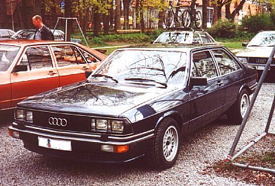 ![]() | This is a 2-door limo converted to Audi 200 looks (and technic!). The 200 front mask has the orange covers (see picture above) painted black. By the way: The wheels are Urquattro wheels. As the 200 had 5x112 while the Audi 100 had 4x108 (that describes the mounting holes in the rims, first number=number of holes, second number=diameter in mm of the circle upon that the holes are.) So this conversion was only possible as the owners converted the whole drivetrain to 200 5T technology. Done very professionally! |