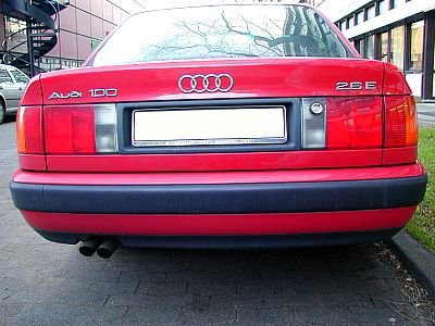 ![]() European Audi 100 with the 2.6 V6. Double exhaust tips, similar to the S4's, but a bit smaller. | ![]() European Audi A6 with the 1.9 inline 4 TDI of the Audi 80 B4. Both TDIs, the 1.9 and the inline 5 2.5, have double exhaust tips, angled downwards. |