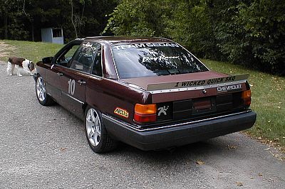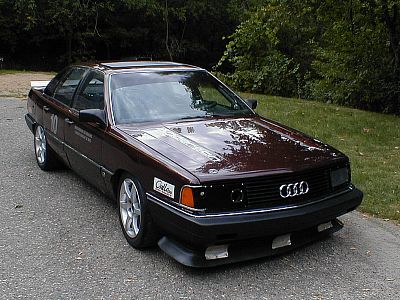 ![]() | Thanks to Larry's thoughtful modifications, his car is on one level with the tuned Porsches. Body work include a front spoiler that was built from a second stock bumper that was cut, turned upside down and riveted onto the old bumper. The rear features a spoiler as seen on the Audi 200 Trans Am. You can pretty clearly see that both headlights now work as air intakes. Larry uses an intercooler that can be sprayed with a mixture of alcohol and water. The system is controlled by what was once the controller for the heated seats. It works so well that a Porsche team has built one, too: They use a hightech version with several sensors and using the engine computer unit! |