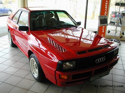 200hp in the Urquattro didn't even make the quattro sweat. The Sportquattro, introduced in 1983 was a civilized version of the Rallye car. It put out 306hp and accelerated in less than 5 seconds from 0 to 100km/h (0 to 60mph). Despite its aerodynamic like a wall (or a paracute) it reached 250km/h (around 156mph). It accelerated faster than the Porsche Turbo of this time and only lost 10km/h (6,25mph) in topspeed. It was 10 inches shorter than the normal quattros, making it one of the most extreme cars worldwide. Somehow, it is still today. If an owner of the once 219 (200 were necessary for Groupe B homologation) decides to sell his, he won't do under 50.000 Euro. The sale lasted pretty long, probably as Audi had set the price very high. To my knowledge, sales lasted from 1984 till 1985. |