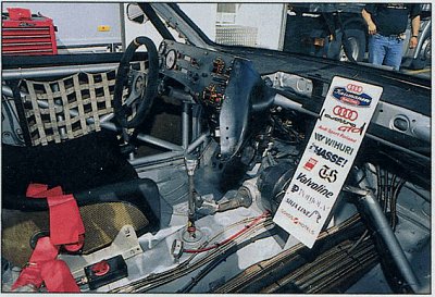 [Note the extra cooling fan left to the board with the sponsors. And especially watch all those lines in the place where the co-driver seat was. Those must be the lines to and from the coolers in the trunk. Looks like a snake-pit!] |